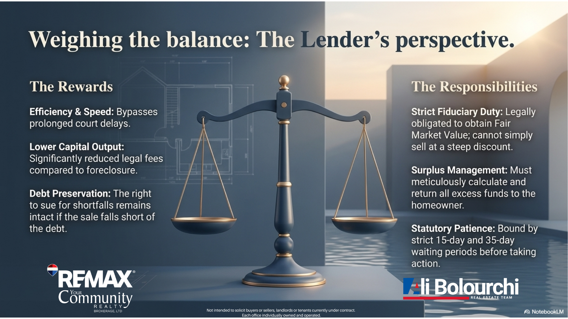 Strict Fiduciary Duty: The lender is legally obligated to obtain Fair Market Value and cannot simply sell the home at a steep discount.