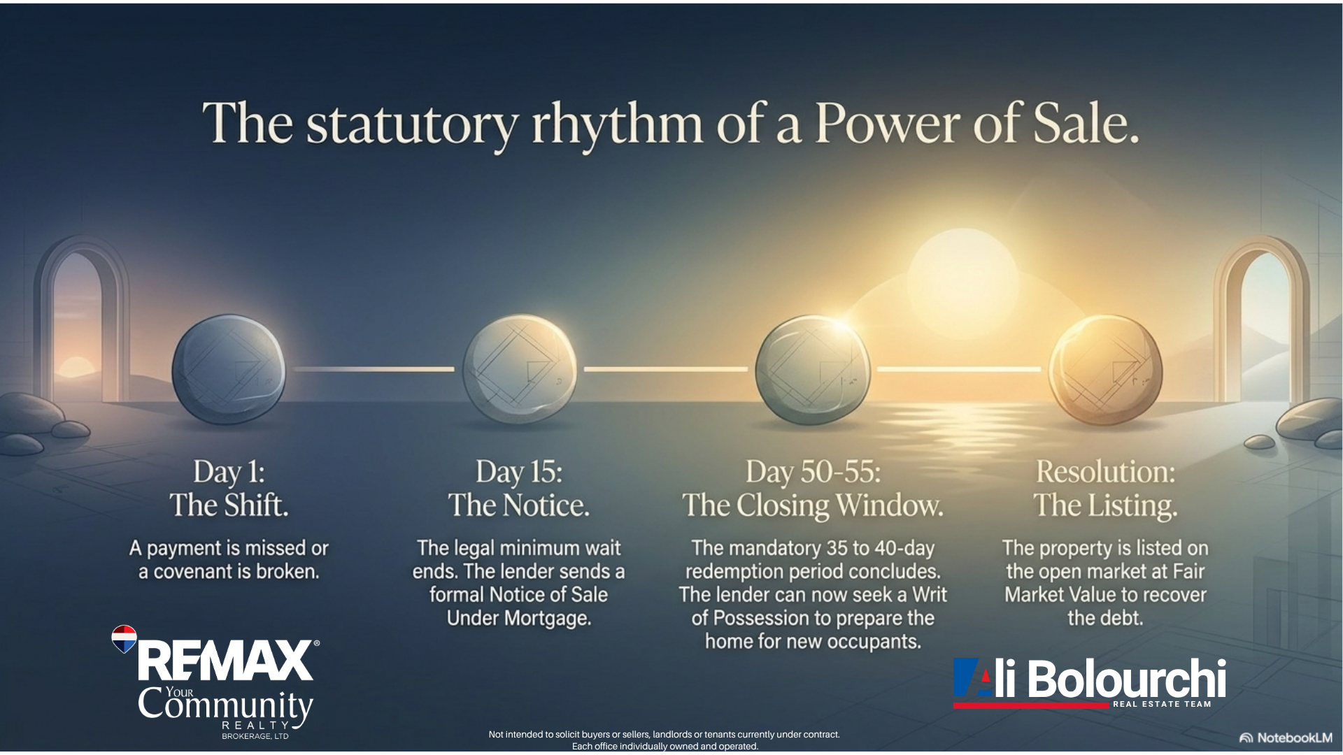 Day 15 - The Notice: The legal minimum wait ends, and the lender sends a formal Notice of Sale Under Mortgage.